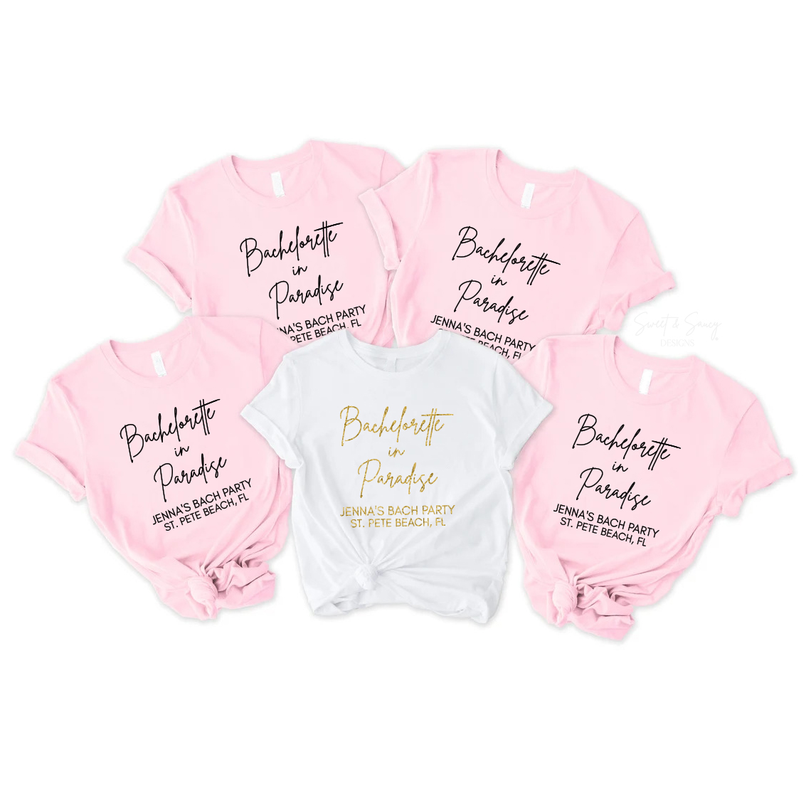 Our shirts are perfect for the Bachelorette in Paradise! The name, colors, and destination are all customizable. We offer glitter, metallic, and plain colors. Shirt is made of quality 100% cotton and is handmade with love.