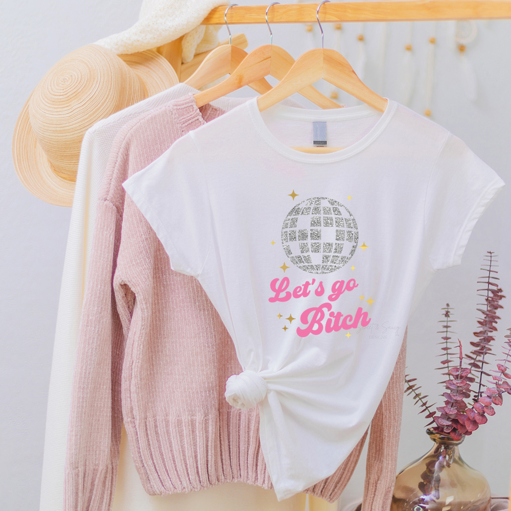 1, 2, 3 Let’s Go Bitch! Shirt is made of quality 100% cotton and is handmade by a fellow fan. Design is silver glitter, pink, and gold metallic. Disco ball is cut out so the inside will show the color of the shirt you choose.